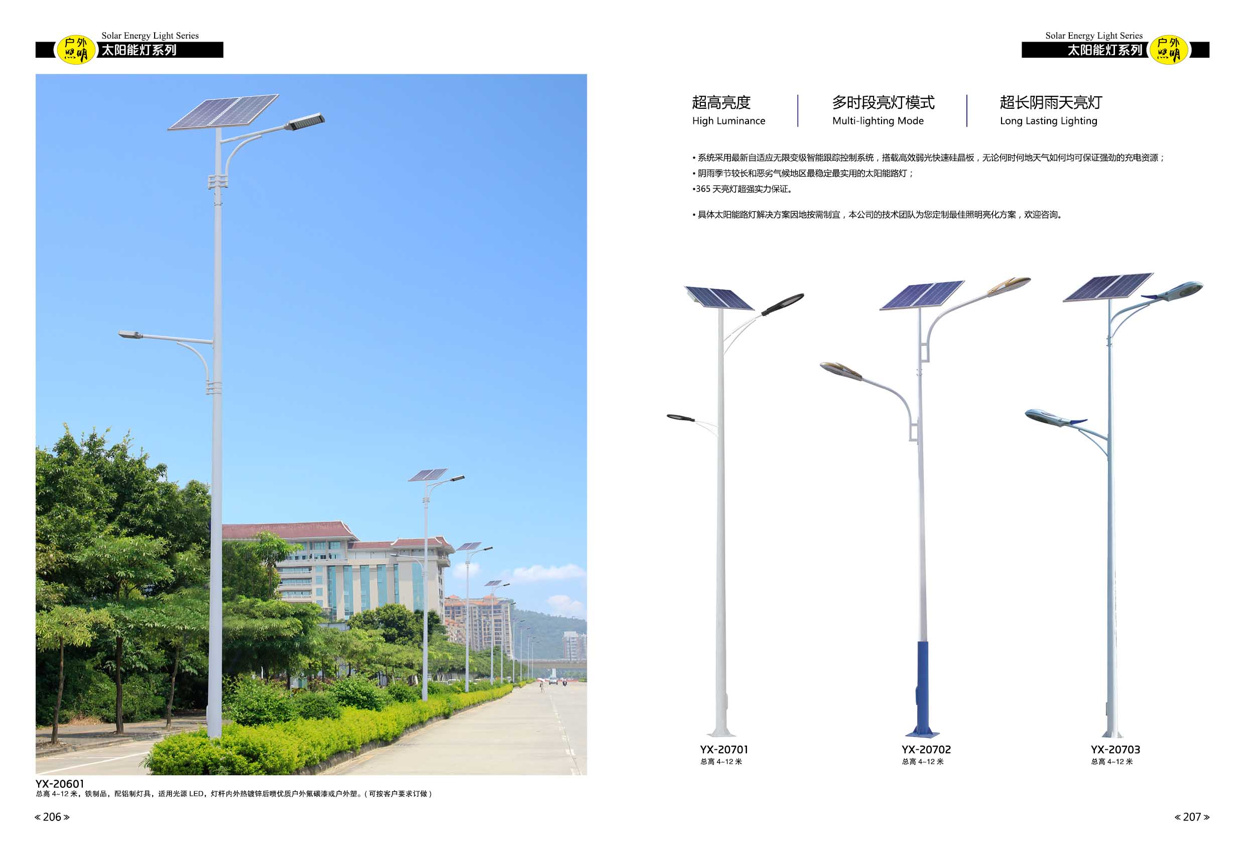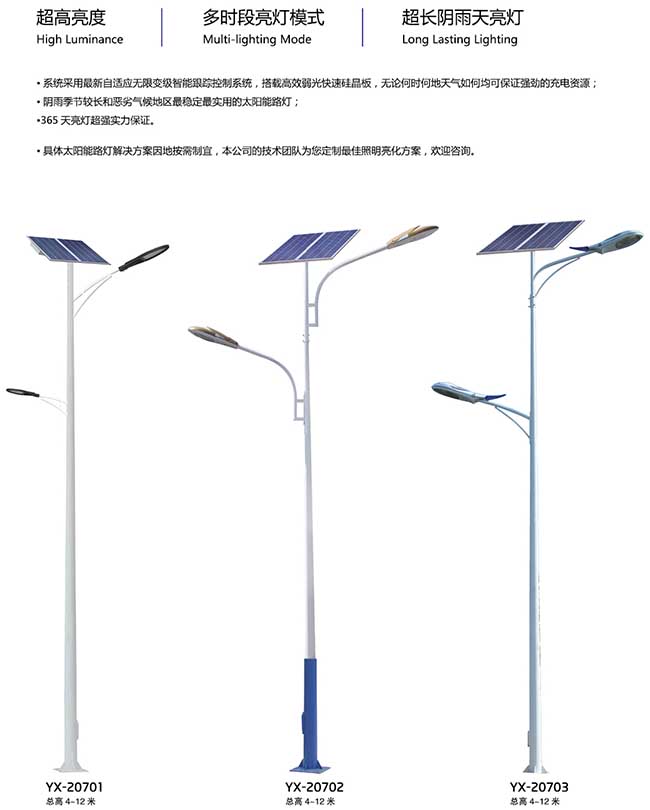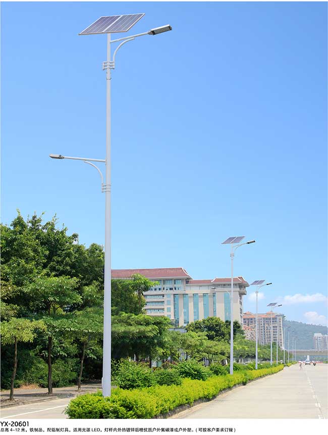 太阳能路灯是采用晶体硅太阳能电池供电,免维护阀控式密封蓄电池(胶体电池)储存电能,超高亮LED灯具作为光源,并由智能化充放电控制器控制,用于代替传统公用电力照明的路灯。无需铺设线缆、无需交流供电、不产生电费;采用直流供电、光敏控制;具有稳定性好、寿命长、发光效率高,安装维护简便、安全性能高、节能环保、经济实用等优点。可广泛应用于城市主、次干道、小区、工厂、旅游景点、停车场等场所。